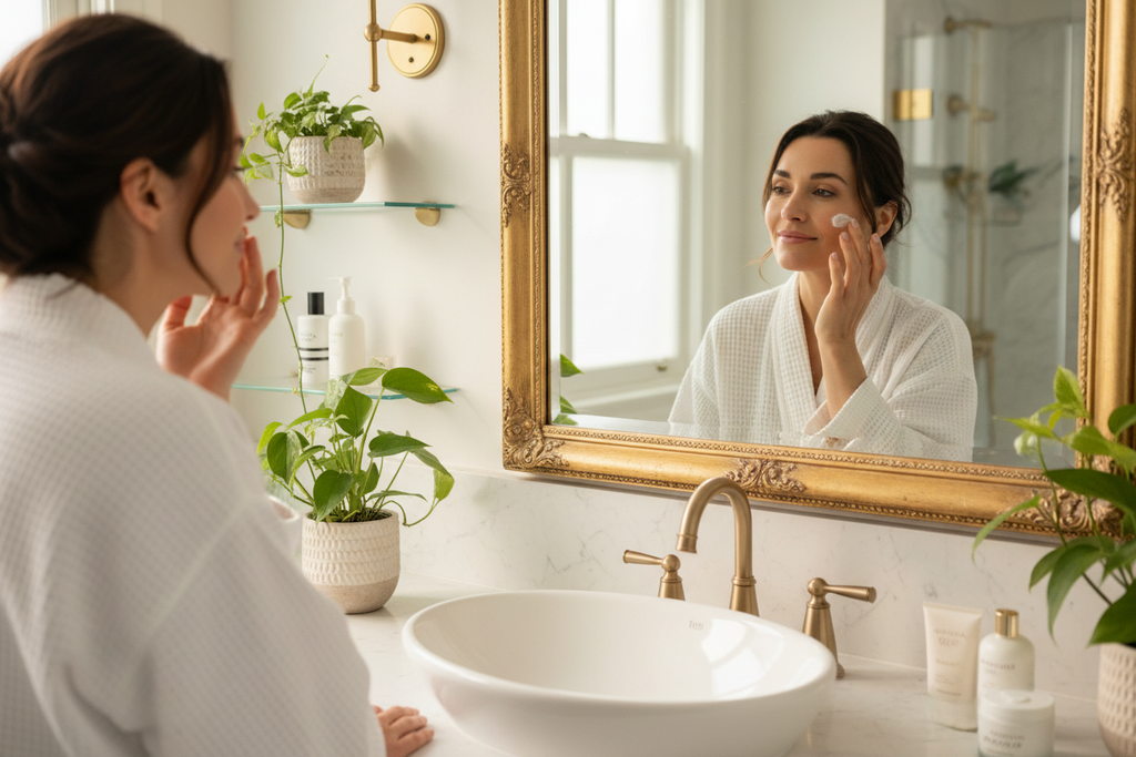 After cleansing and serums, dispense a couple pumps into your palms. Lightly press and massage in upwards, circular motion onto your skin. Pat gently around your eyes. Remember to always include your neckline and décolletage!